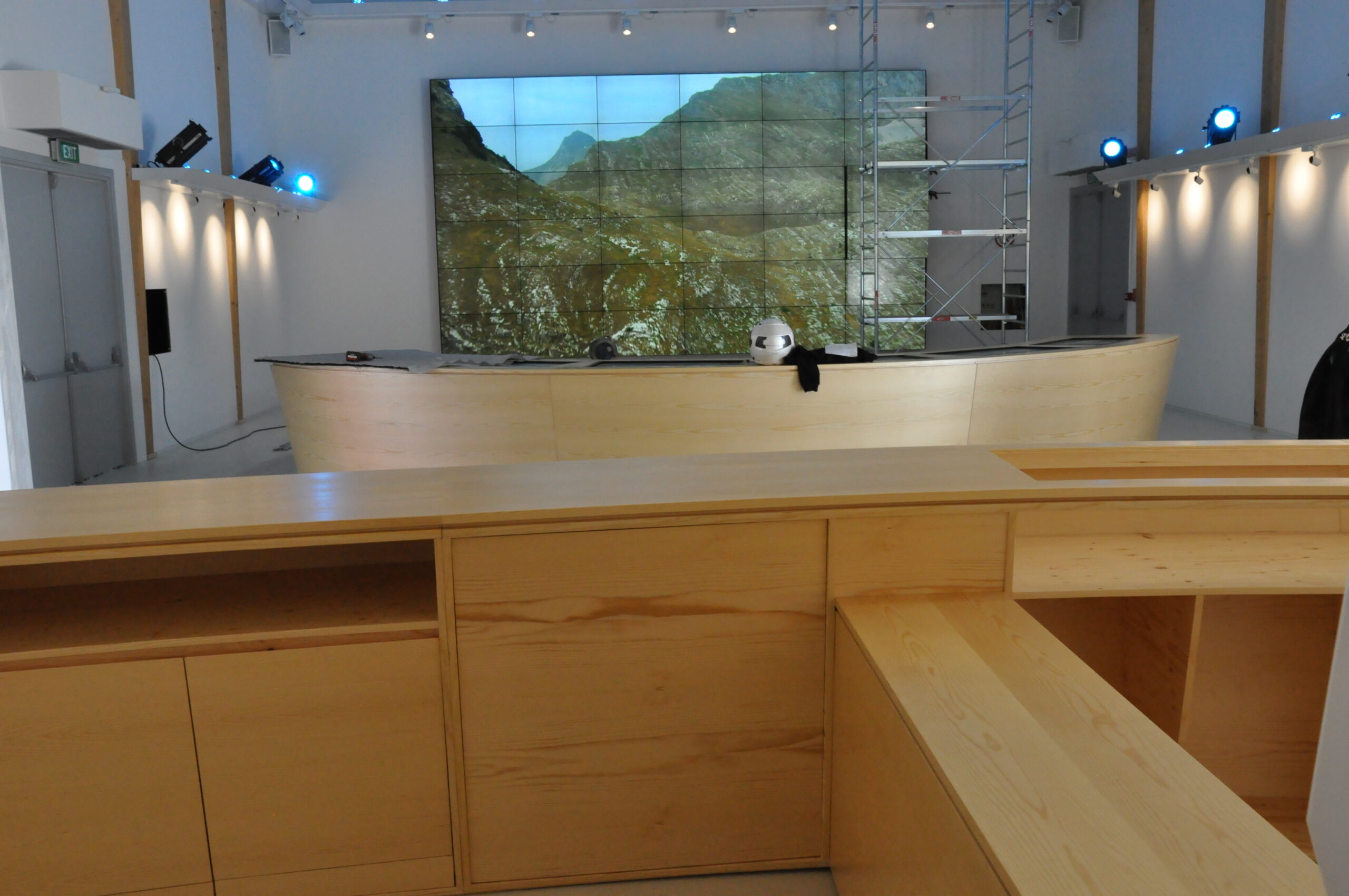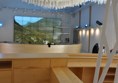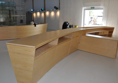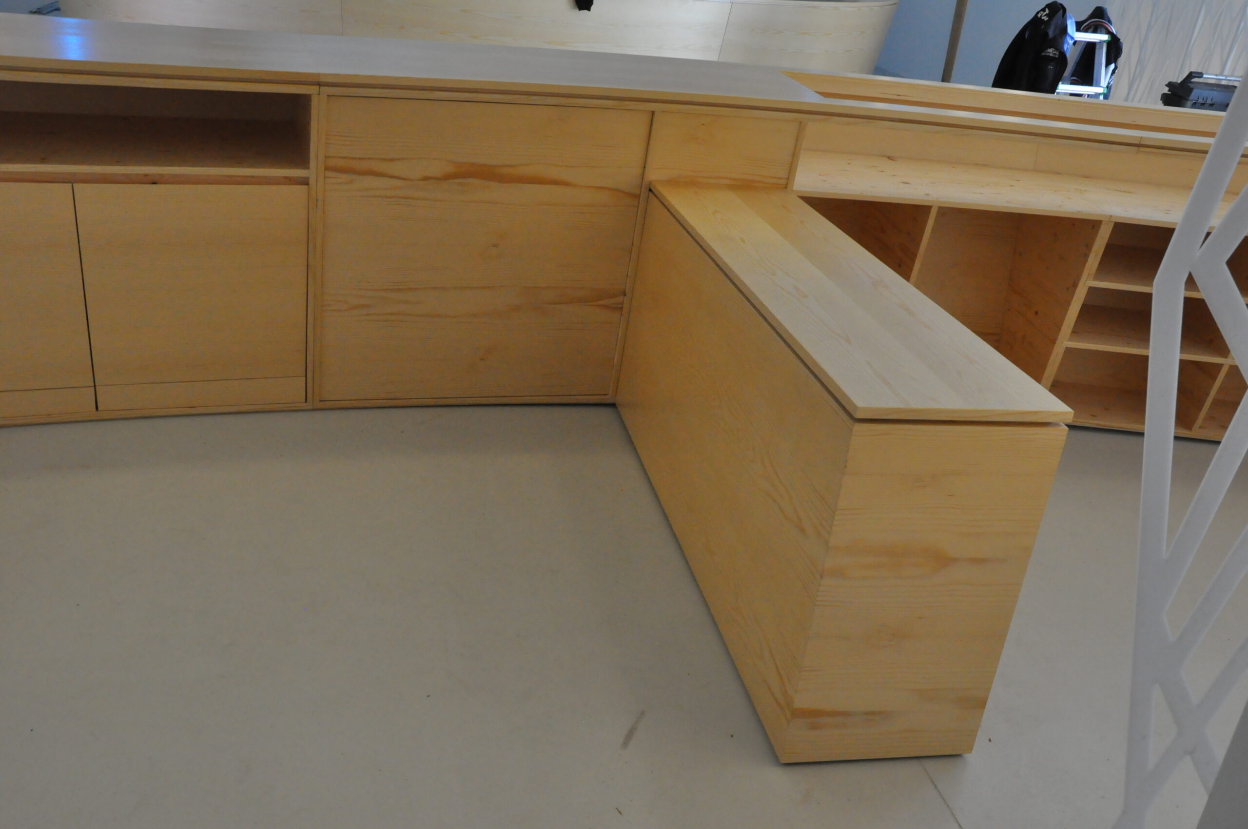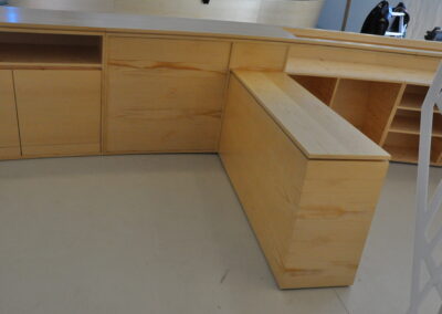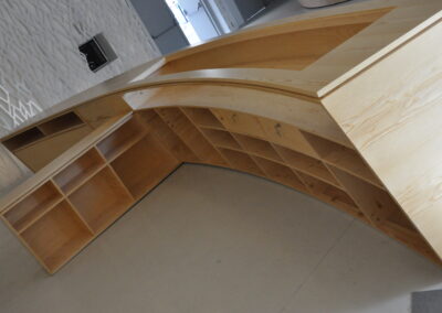 Abbiamo realizzato su misura un grande bancone curvo in multistrato impiallacciato, progettato per spazi espositivi o di accoglienza. Il design segue una linea fluida e continua, con vani a giorno e ante integrate per offrire praticità senza rinunciare all’estetica. Ogni modulo è stato sagomato e assemblato con precisione per garantire un effetto visivo uniforme e moderno.