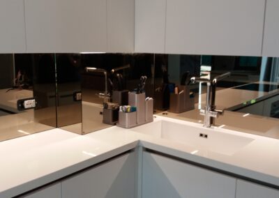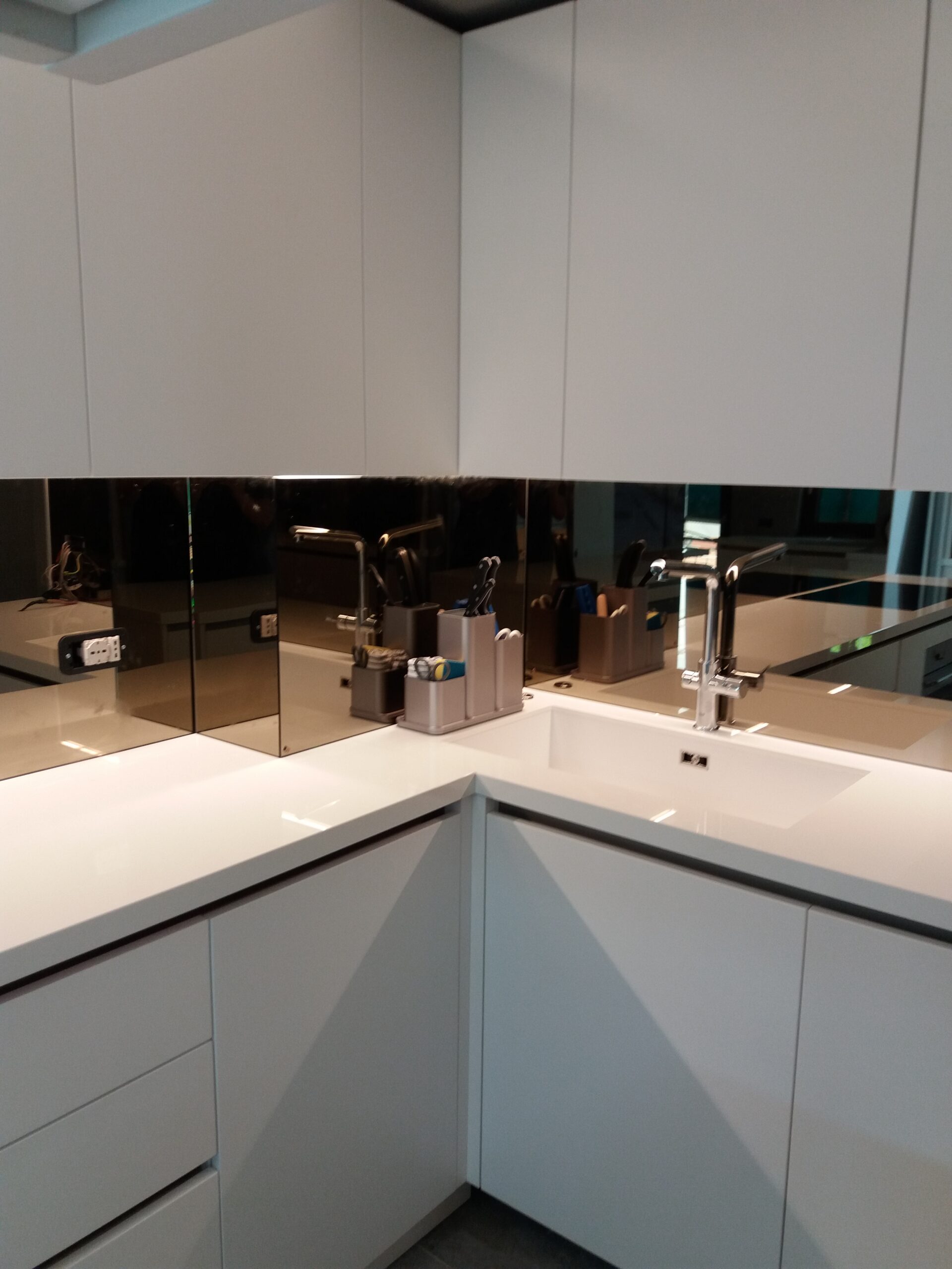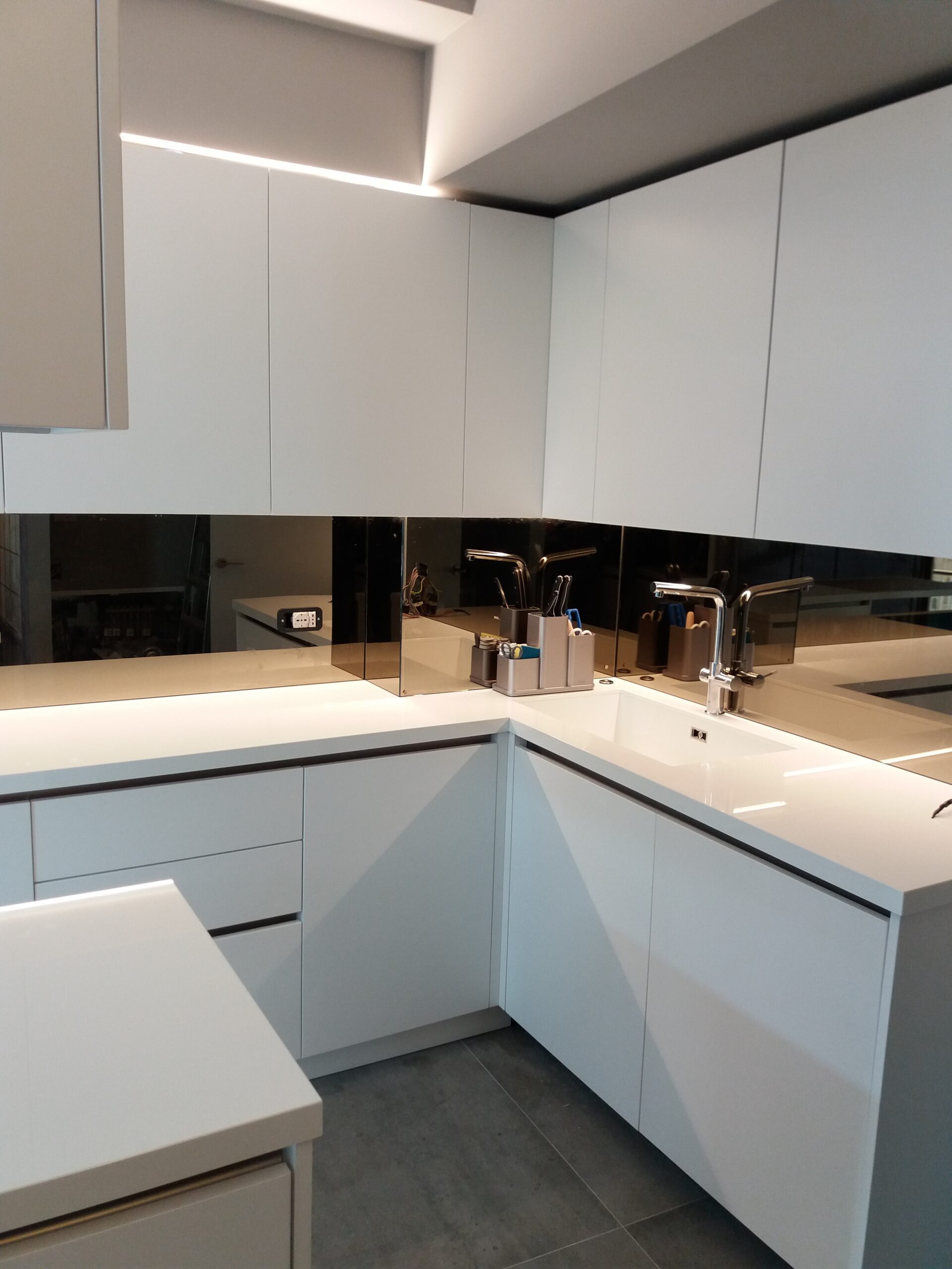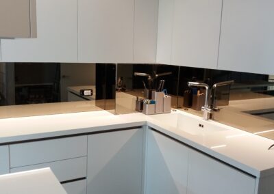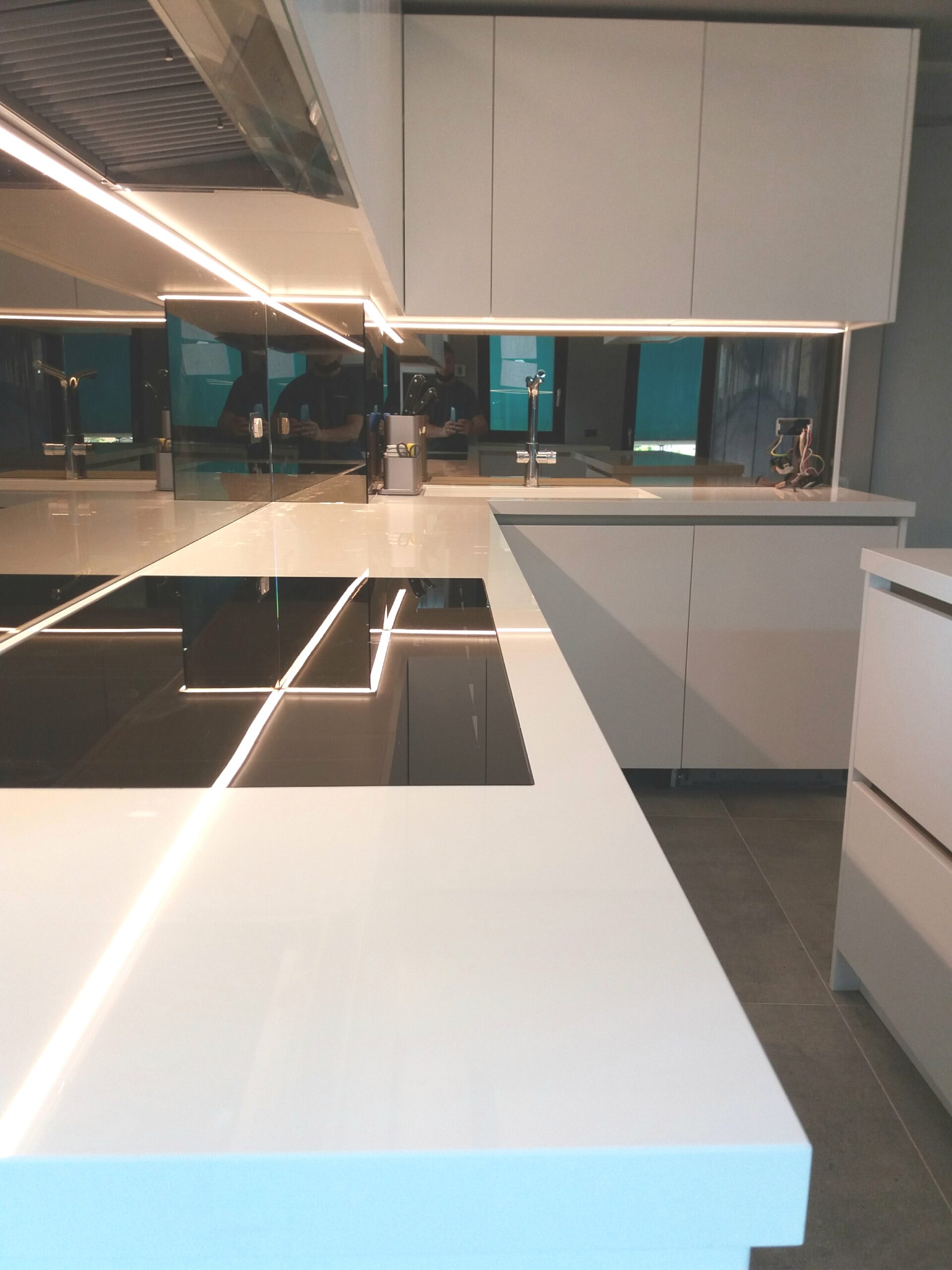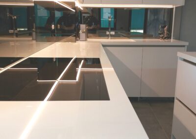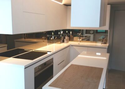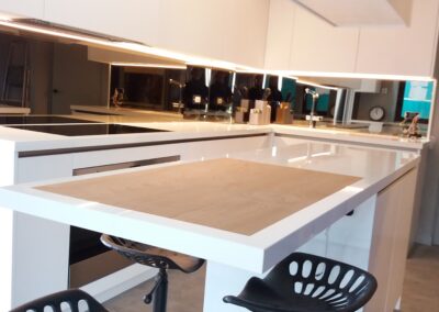 Il piano snack integrato, con inserto centrale in rovere fiammato, aggiunge un tocco artigianale che rende unica la composizione. I pensili sospesi e l’illuminazione a LED incassata donano leggerezza e luminosità all’ambiente, mentre la specchiera a parete amplifica la profondità della cucina.