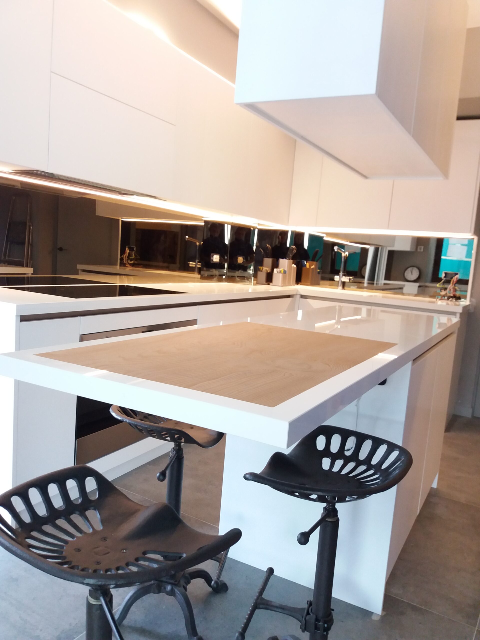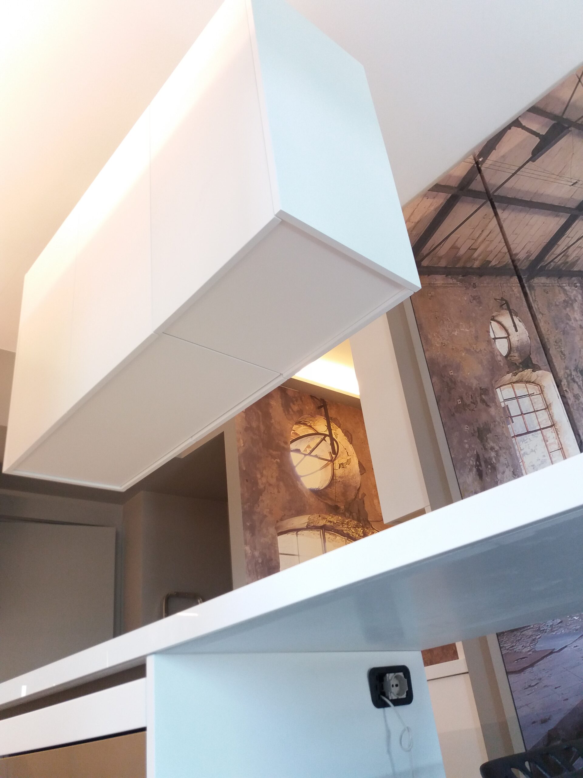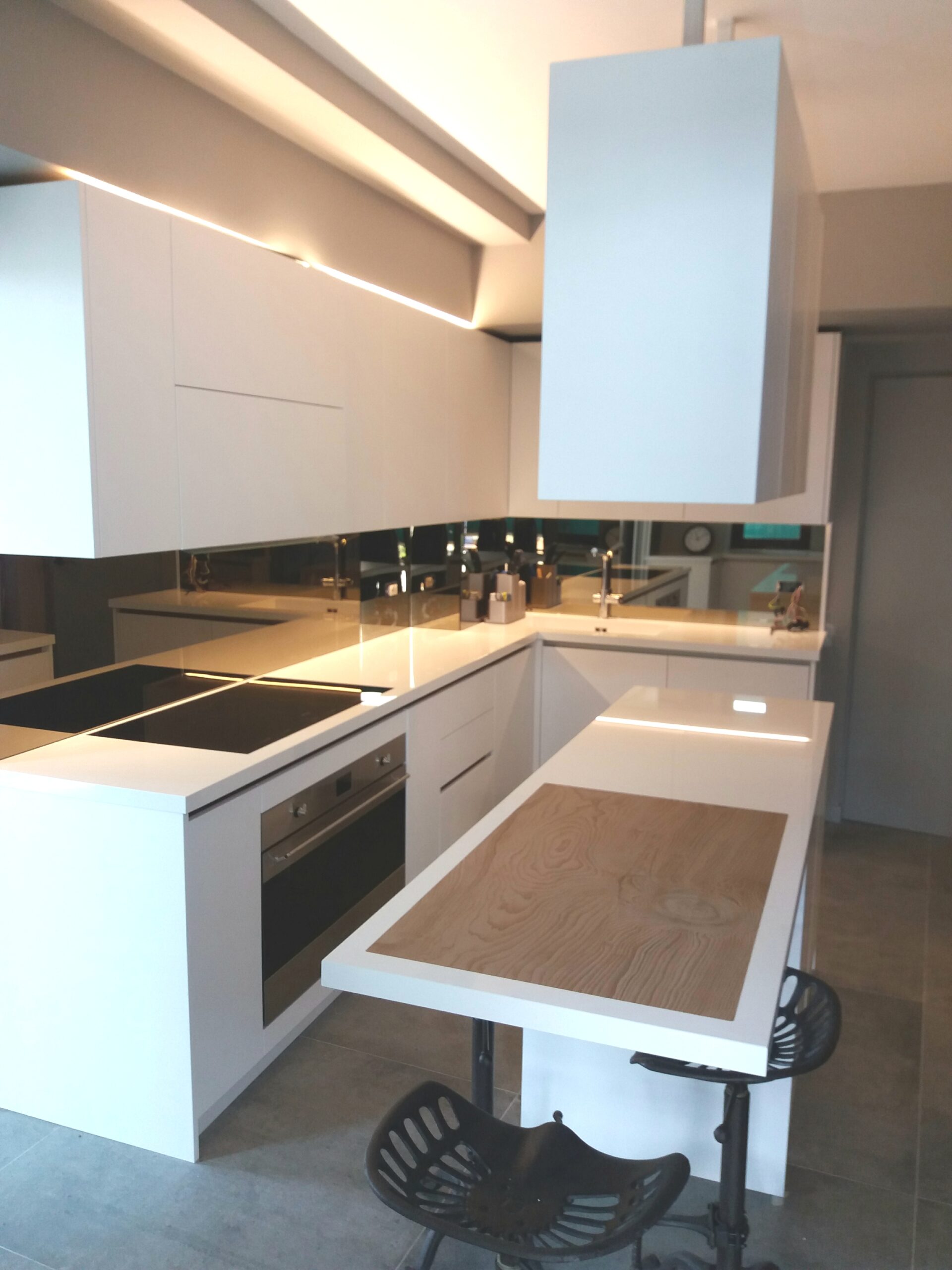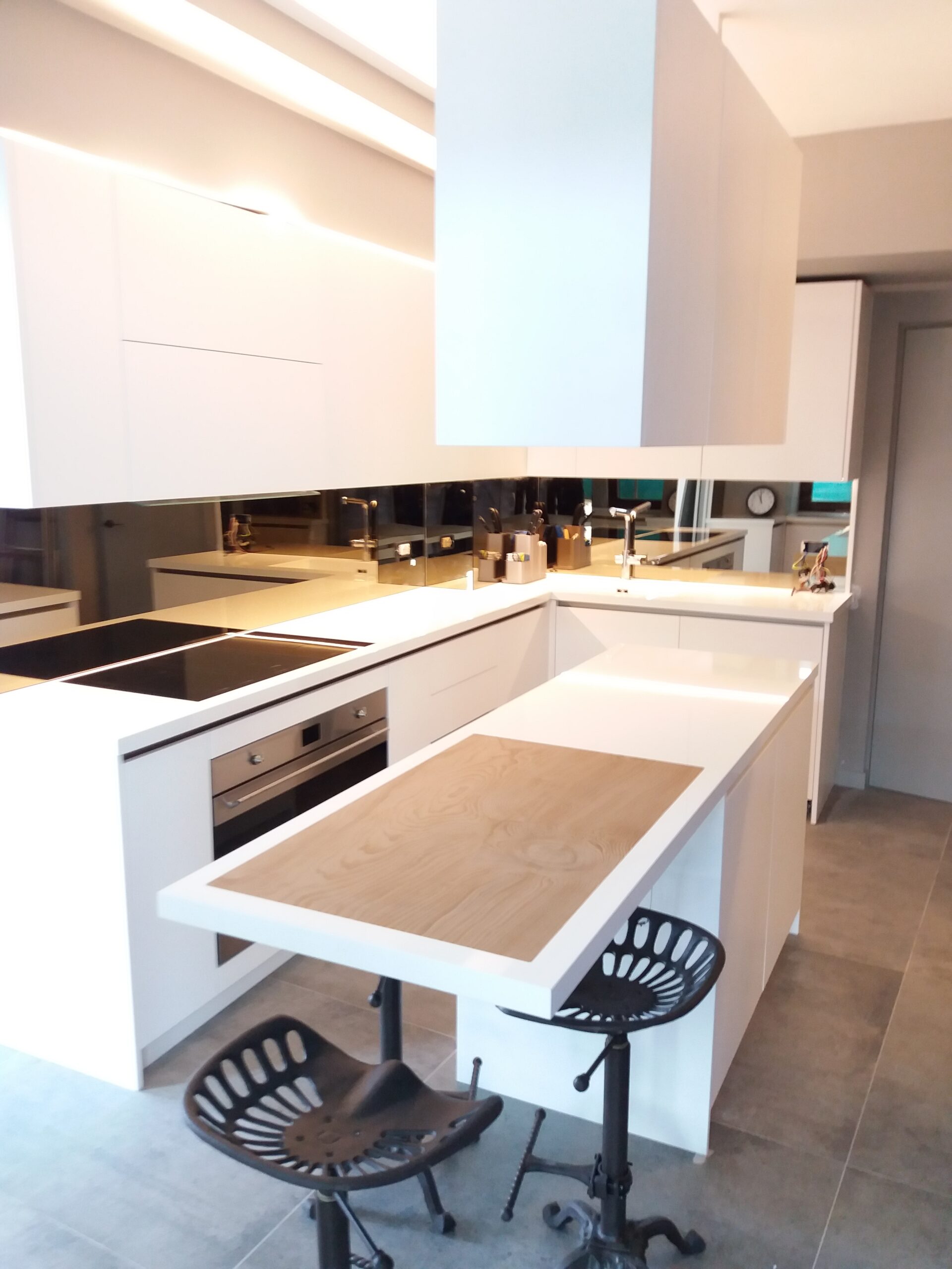 Cucina su misura in laccato bianco con inserti in legno naturale