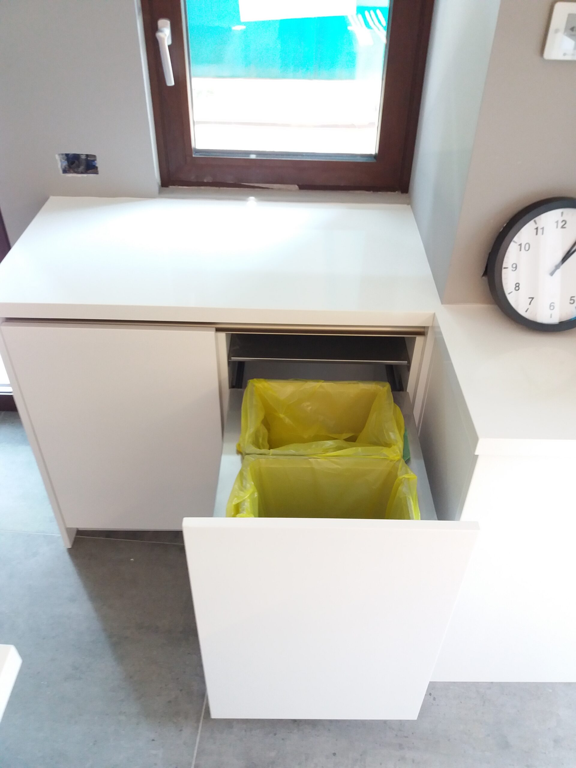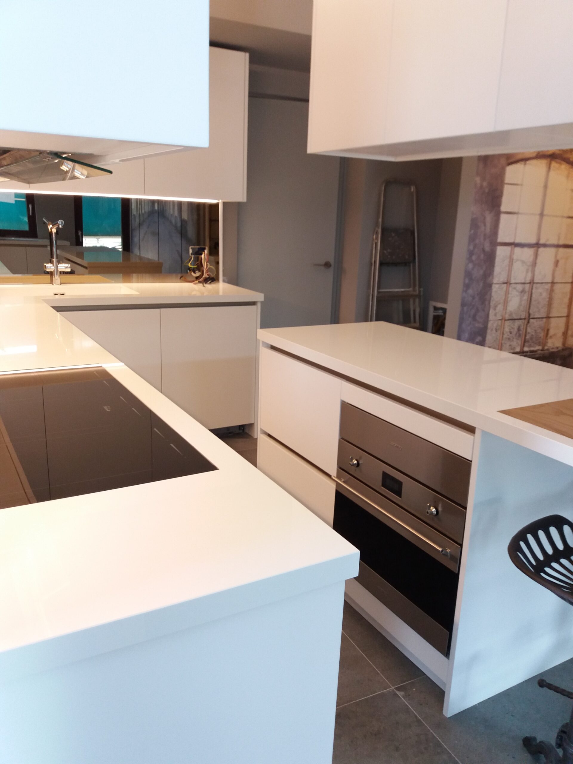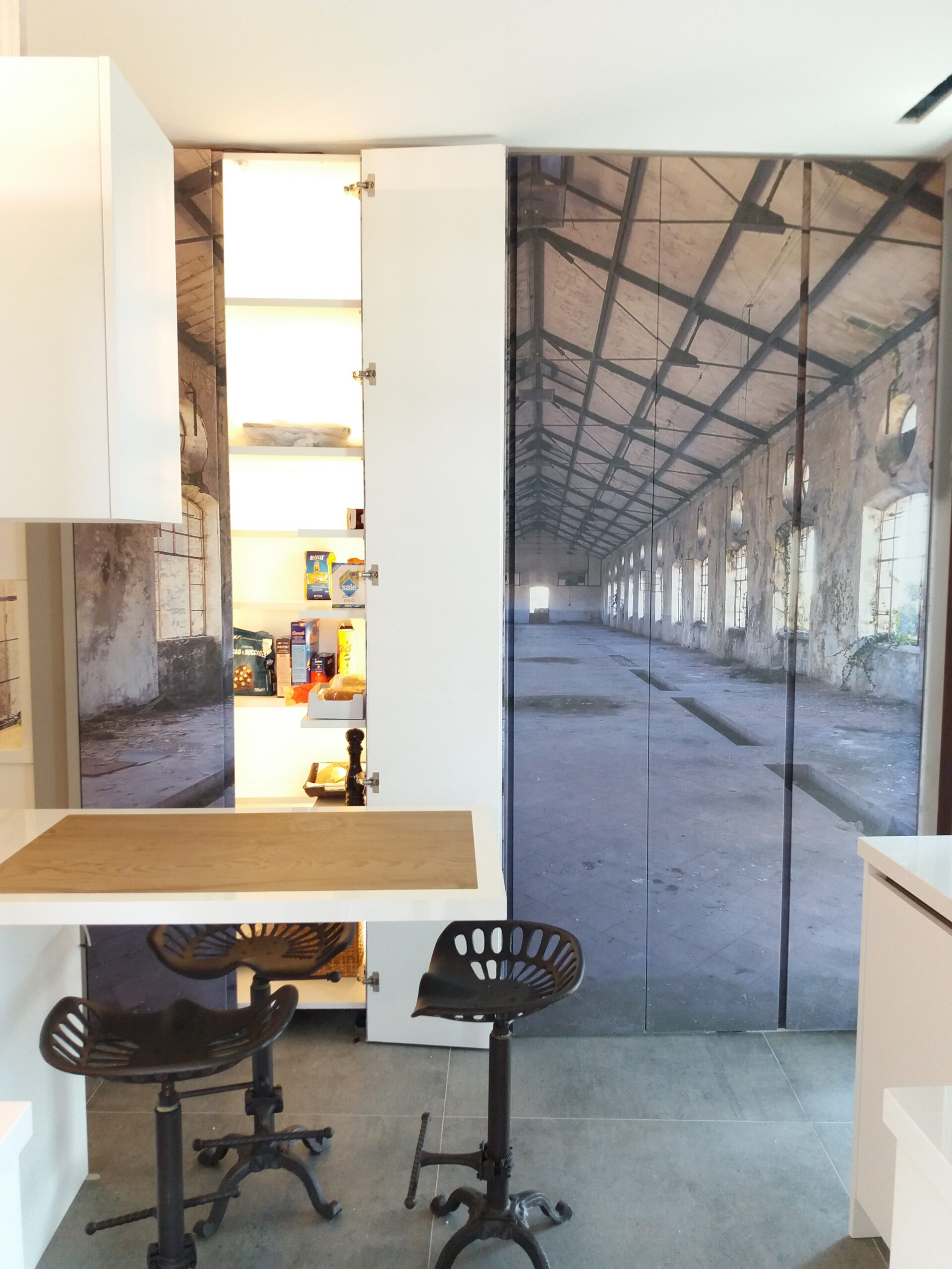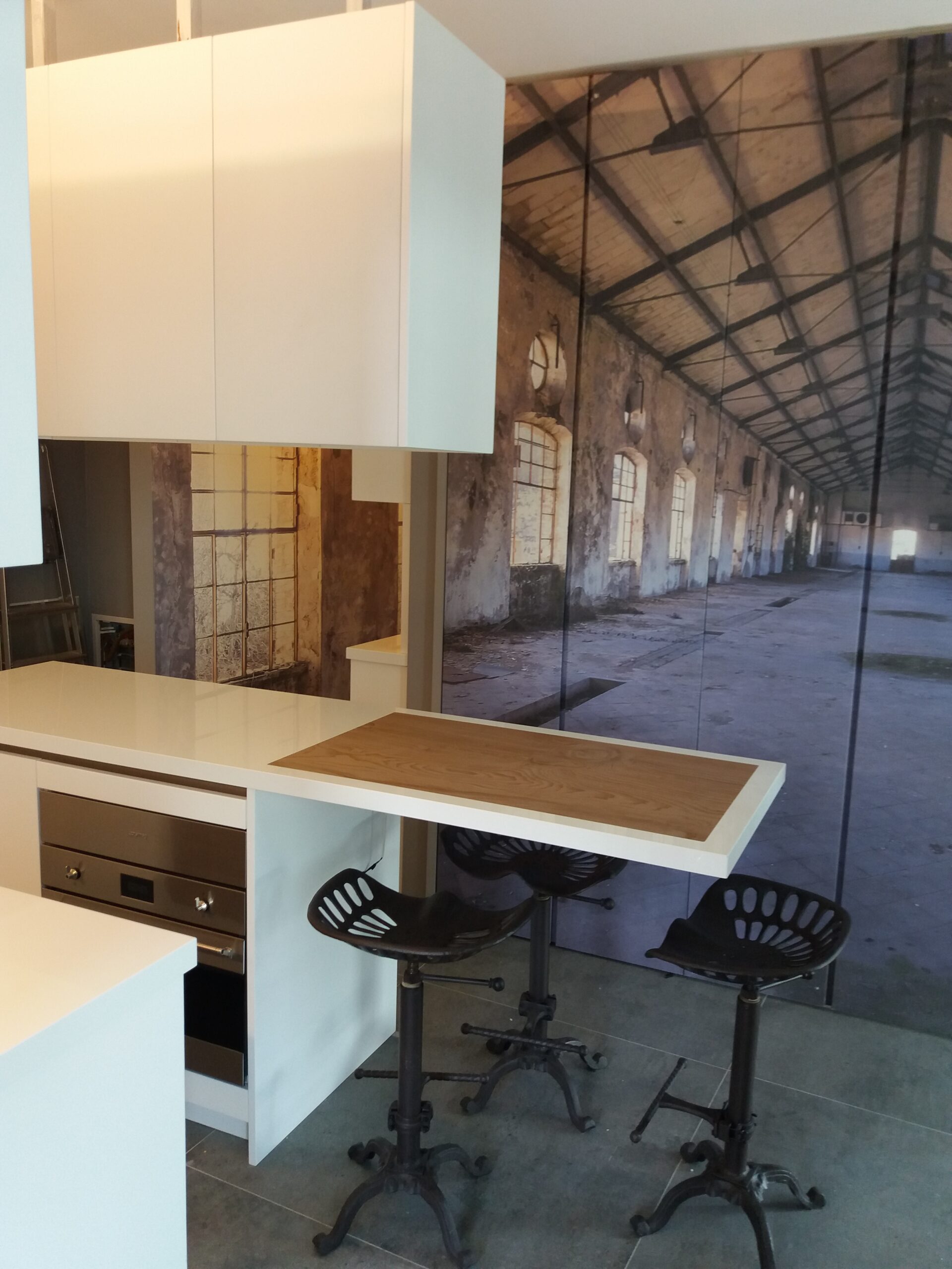 Cucina su misura in laccato bianco con inserti in legno naturale