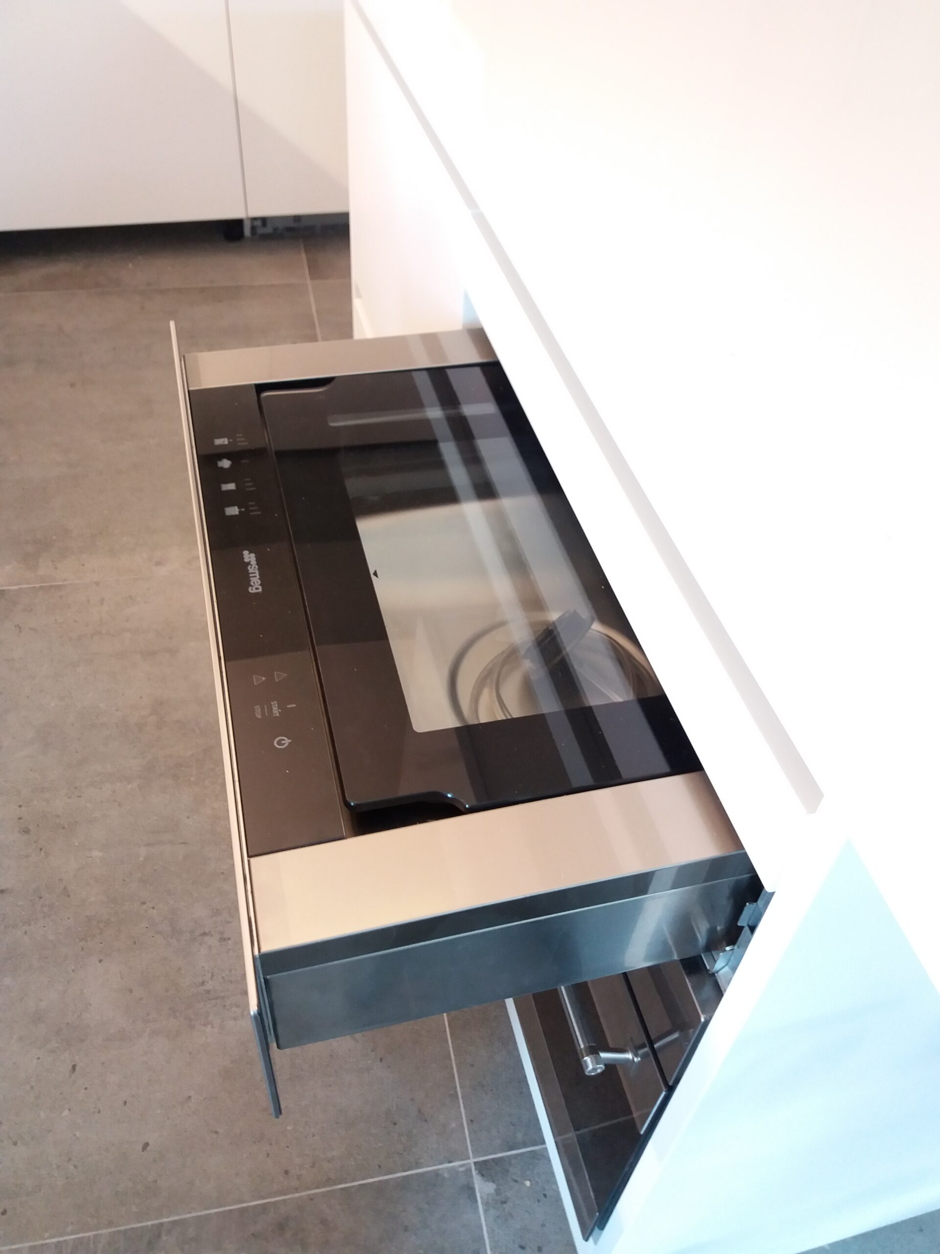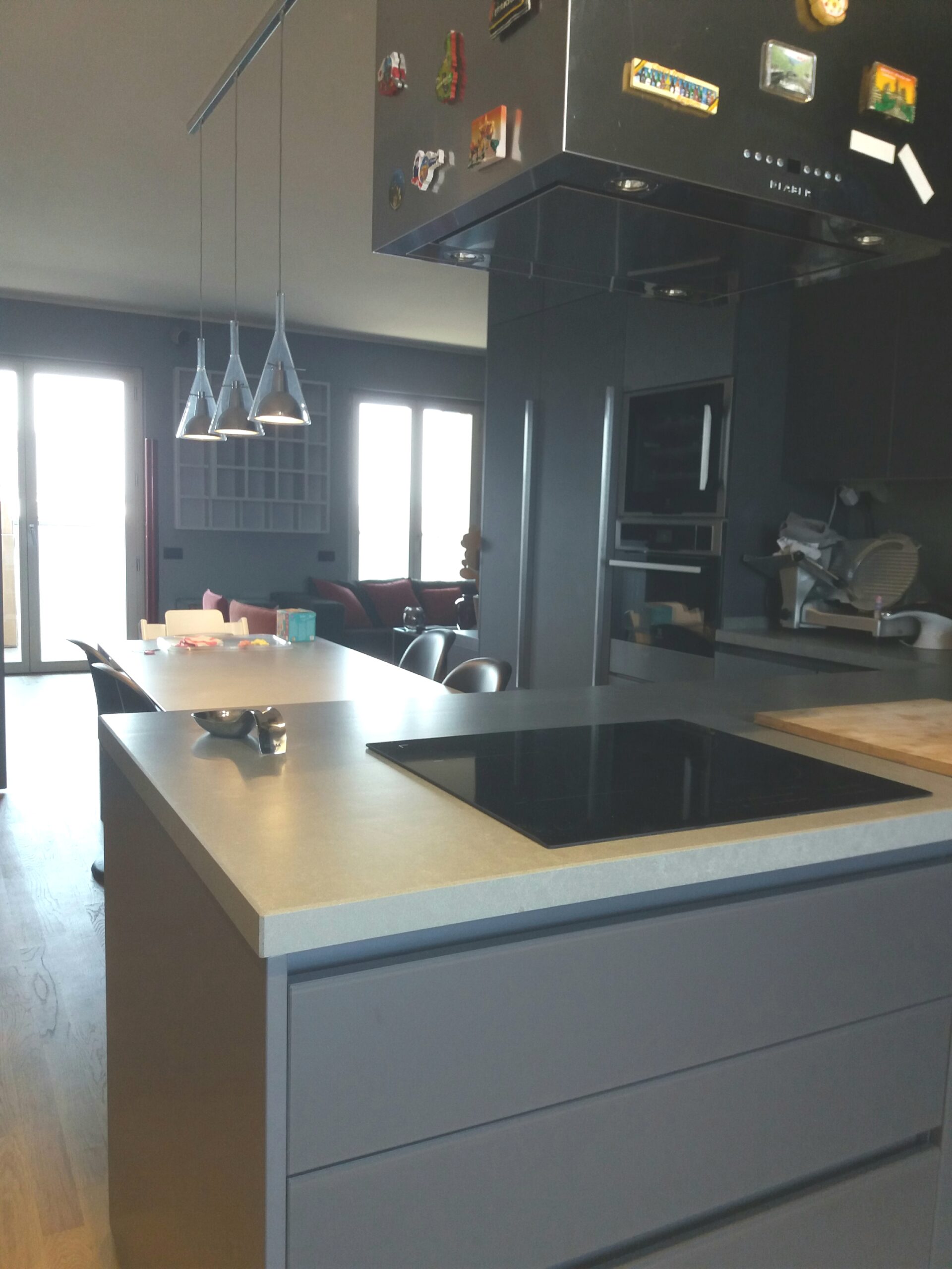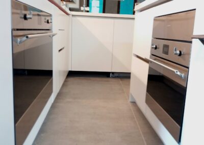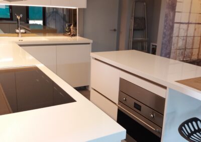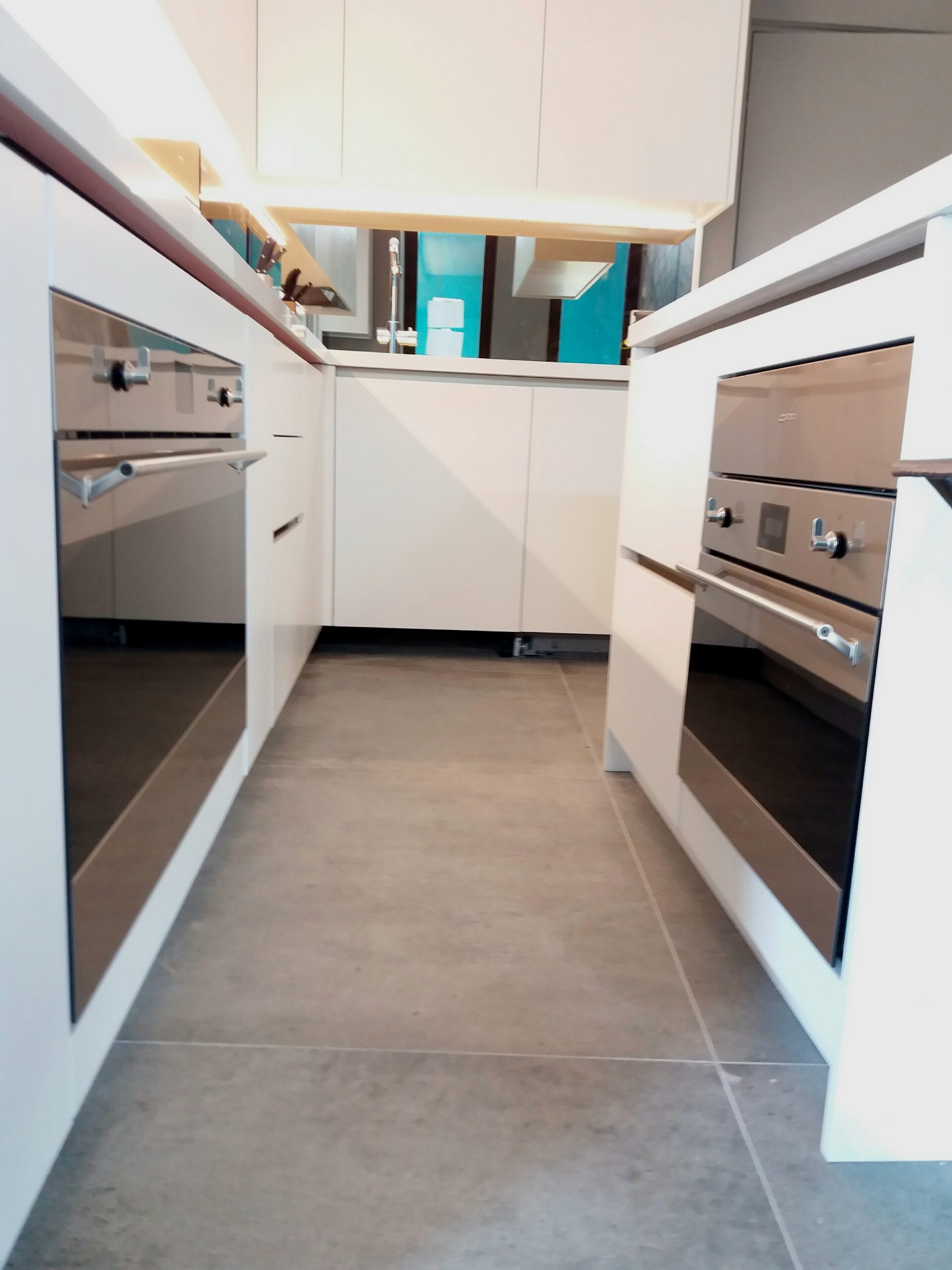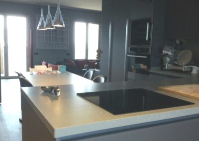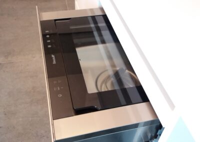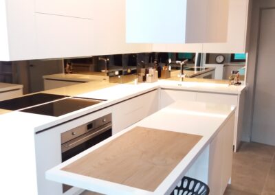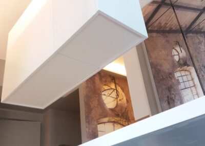 Un progetto moderno, pulito ed elegante, nato per valorizzare gli spazi senza rinunciare alla funzionalità. Le superfici in laccato opaco bianco dialogano con il calore del legno naturale, creando un contrasto raffinato e accogliente.