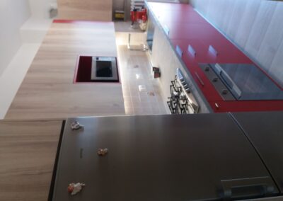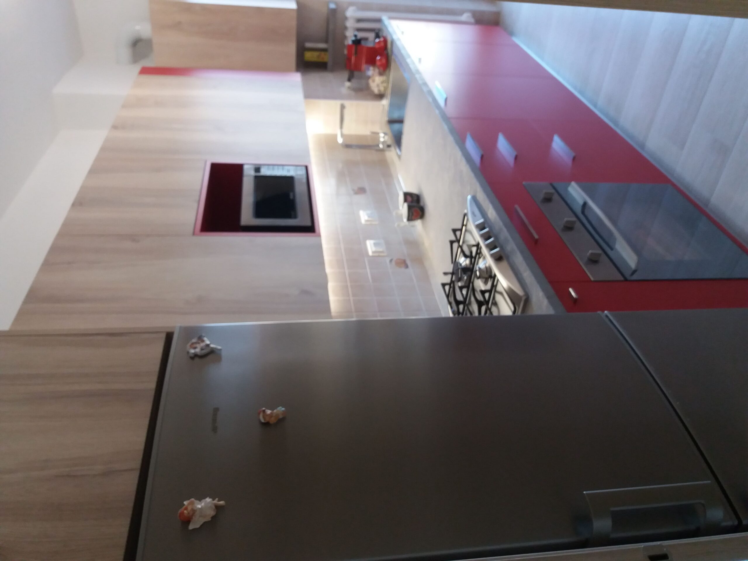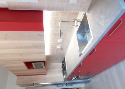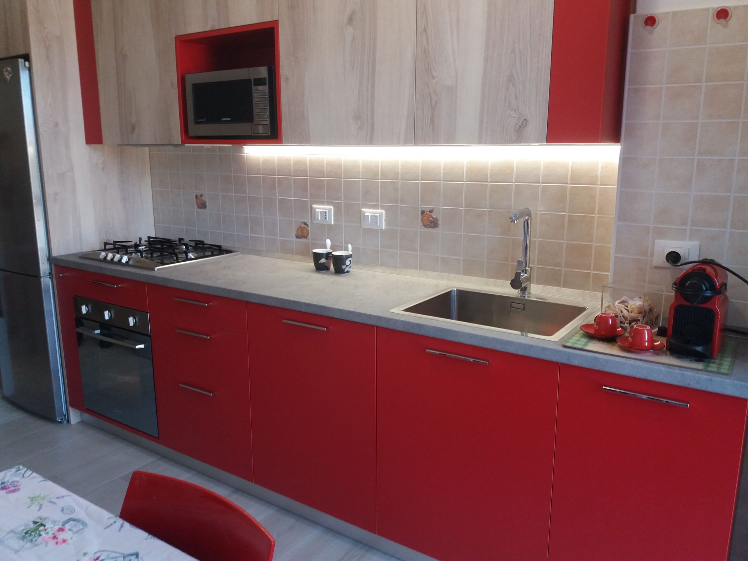 Cucina lineare realizzata su misura con ante laccate rosse opache e pensili in rovere chiaro.
