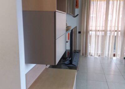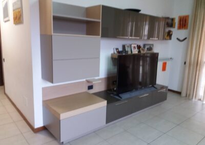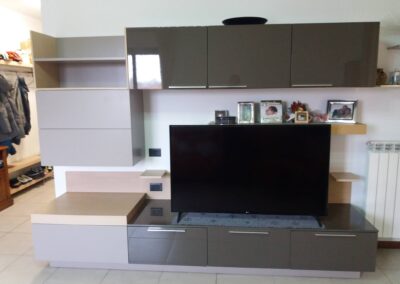 In questo progetto abbiamo realizzato una parete attrezzata su misura, studiata per accogliere TV, dispositivi multimediali e oggetti personali, mantenendo ordine ed eleganza. I volumi alternati, i giochi di profondità e le finiture laccate lucide e opache creano un equilibrio visivo raffinato, perfettamente integrato nell’ambiente domestico.