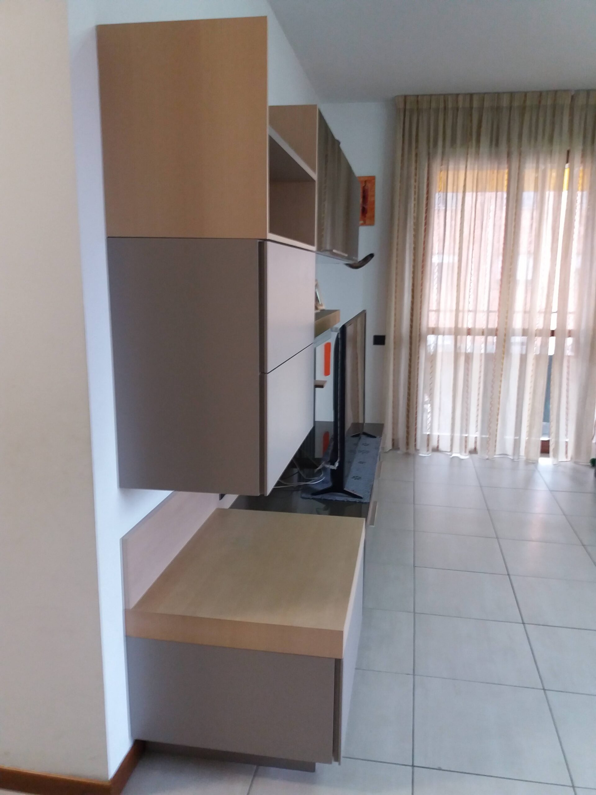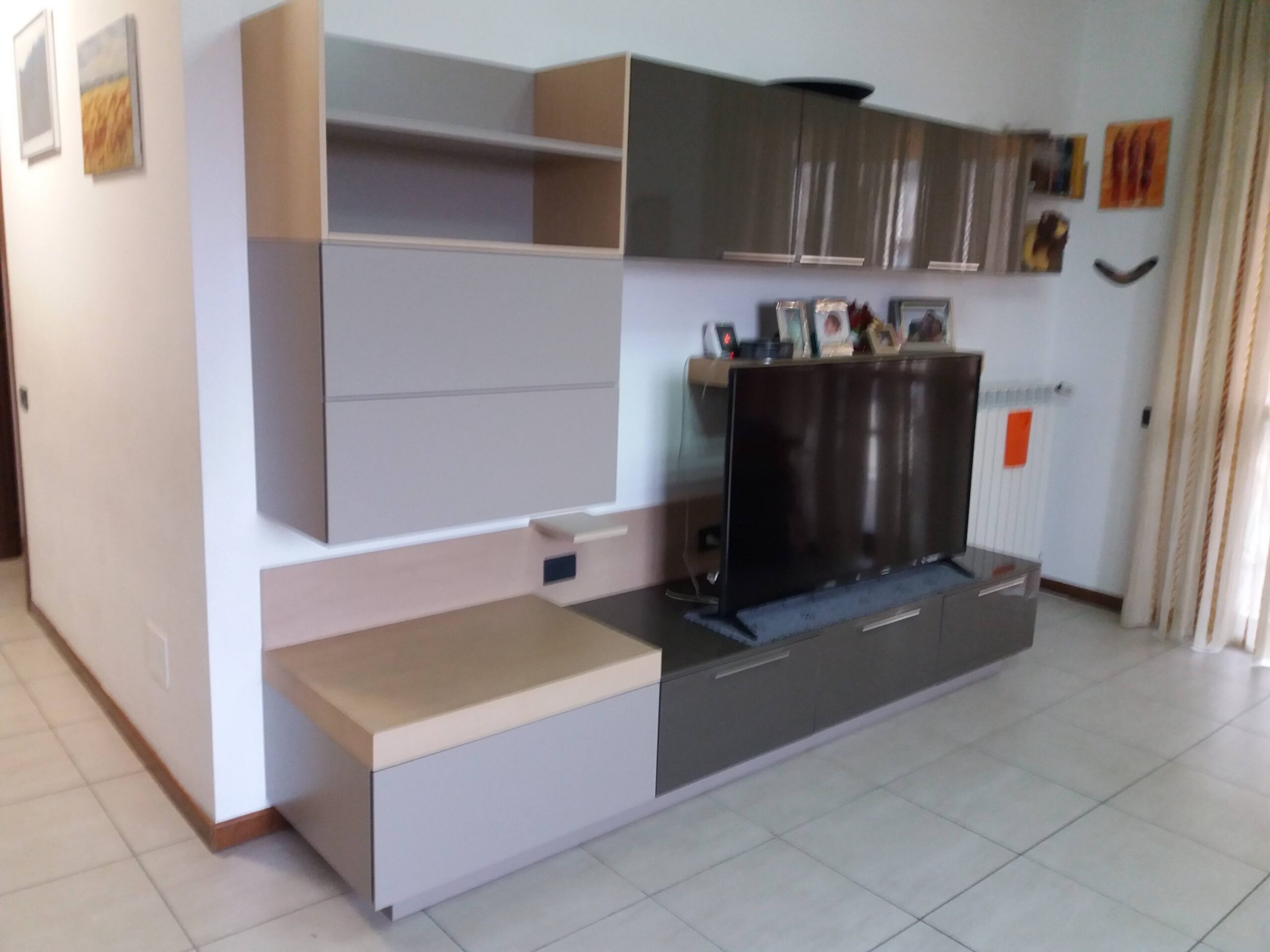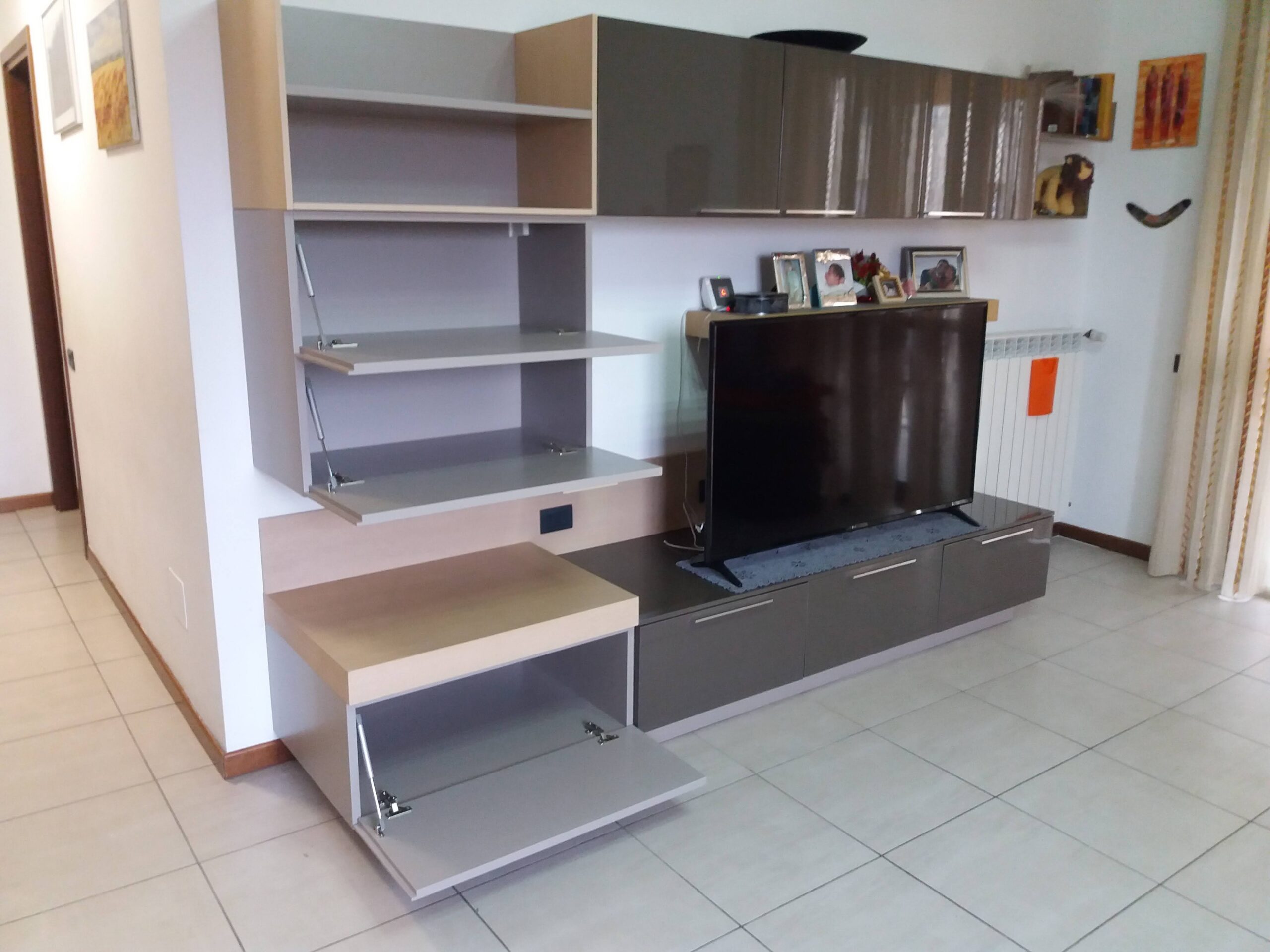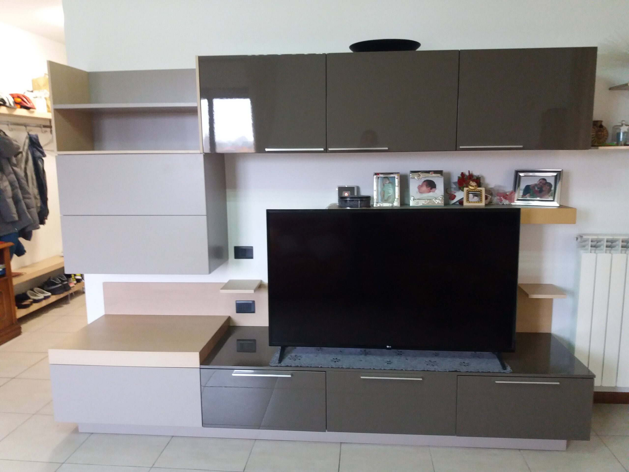 Il mobile è stato progettato dialogando con il cliente, partendo dalle sue esigenze quotidiane fino a definire ogni dettaglio tecnico. La combinazione di colori neutri — tortora, sabbia e grigio fumo — conferisce sobrietà, mentre la modularità garantisce versatilità e capienza.