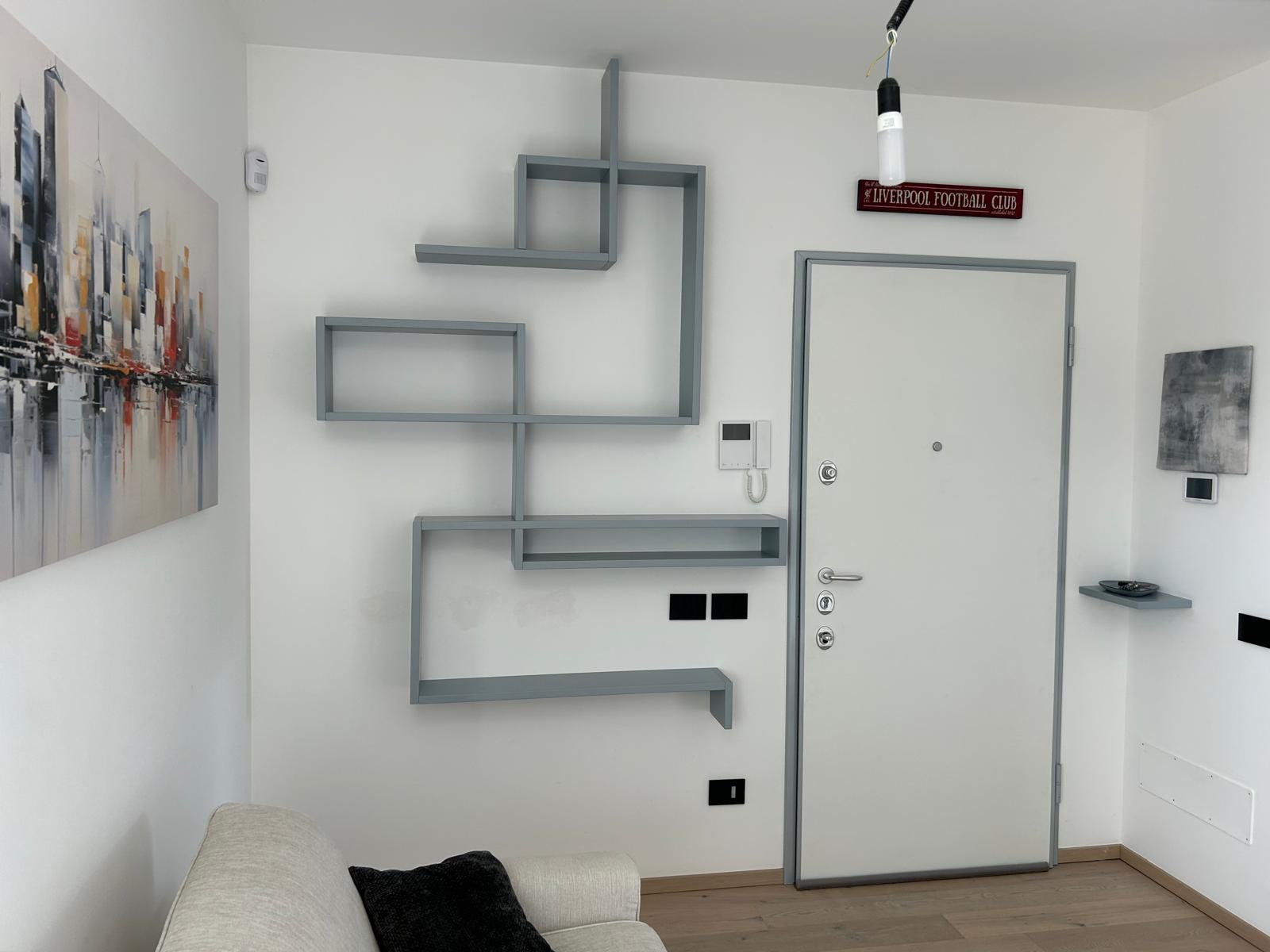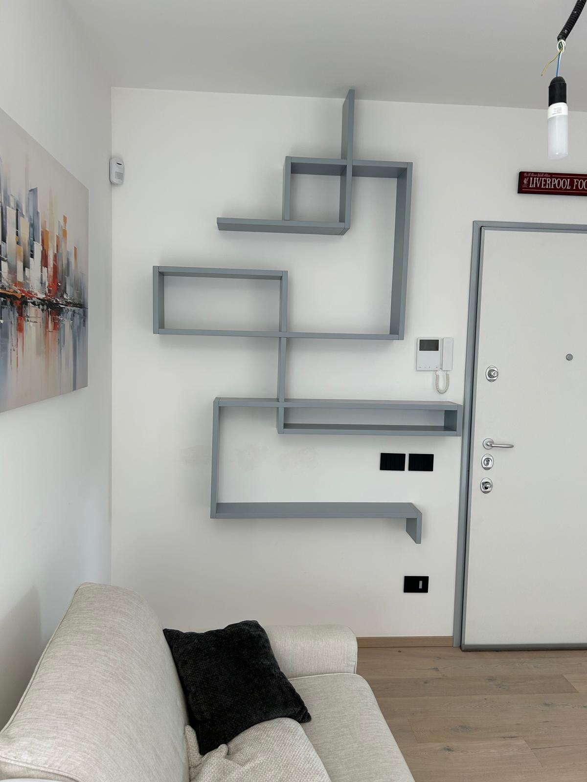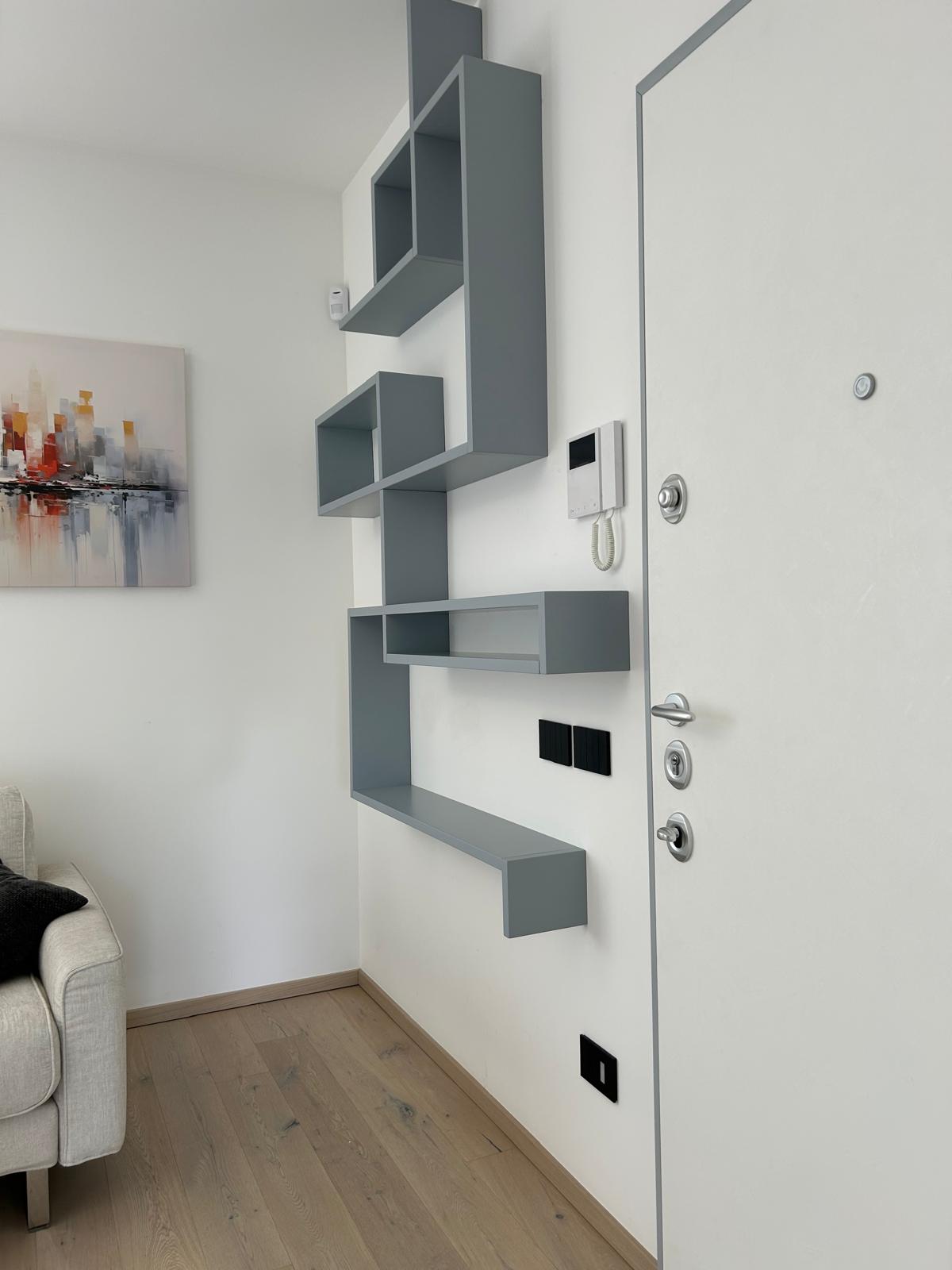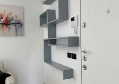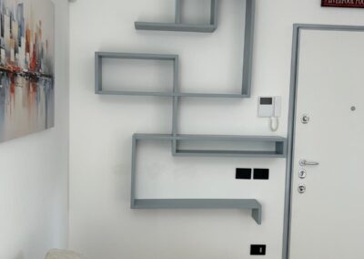 Abbiamo realizzato e installato una libreria su misura in MDF laccato grigio chiaro, progettata con i nostri architetti per valorizzare l’ingresso. Il design geometrico si integra con l’ambiente moderno e sfrutta lo spazio in modo funzionale ed elegante.