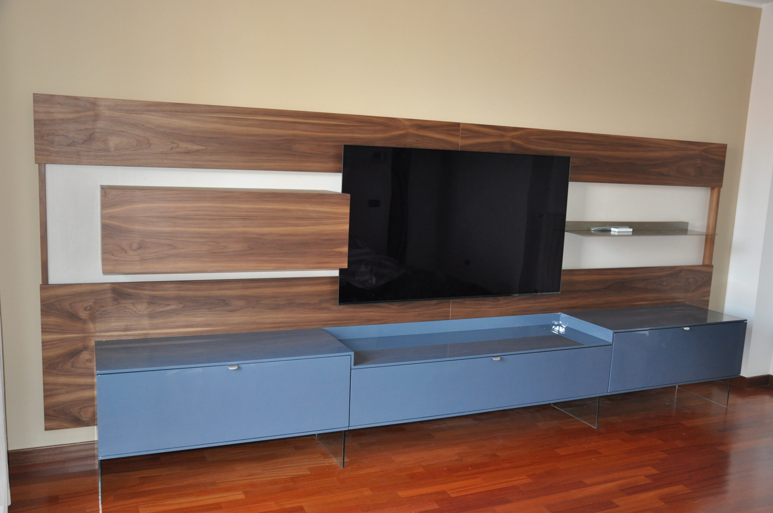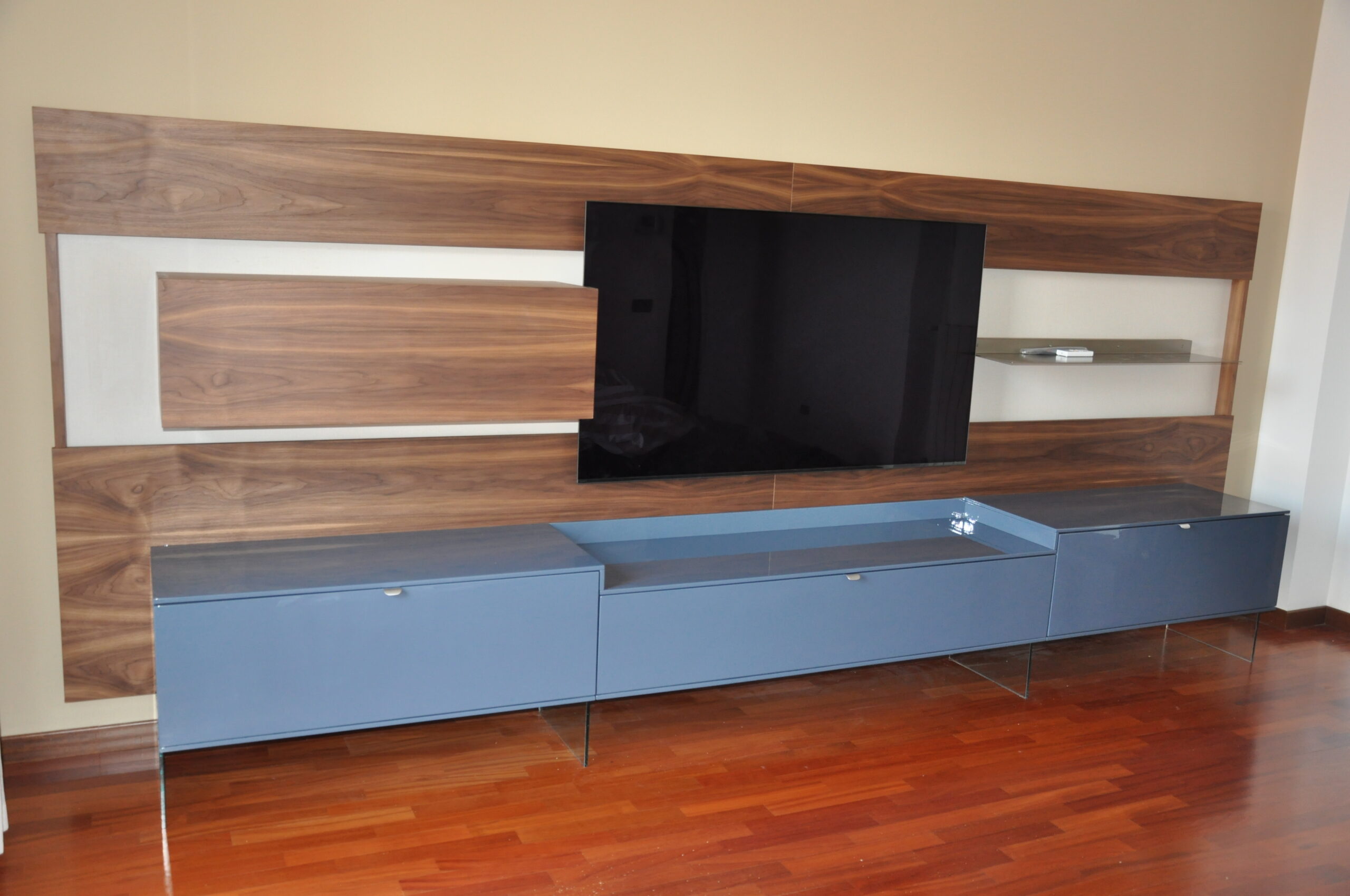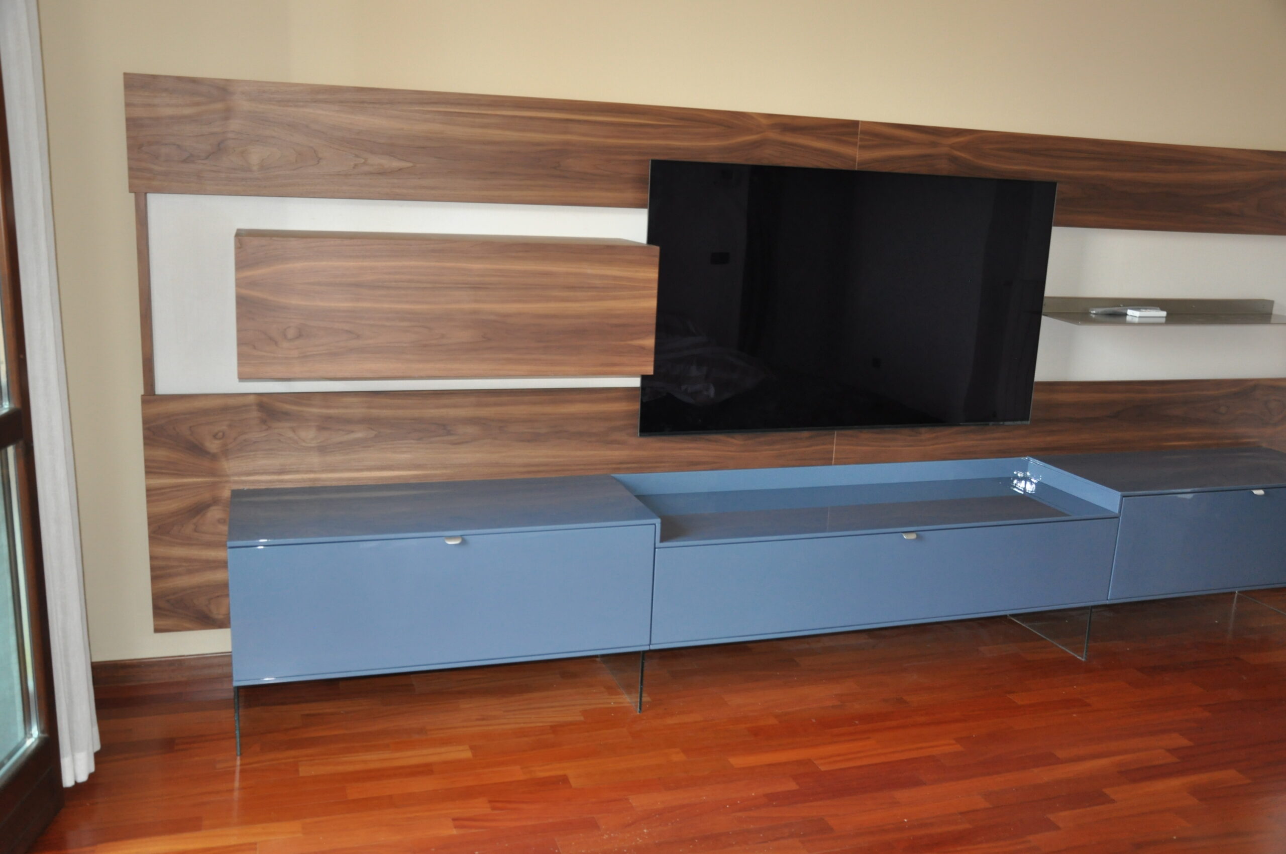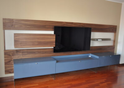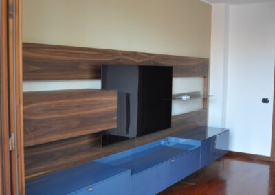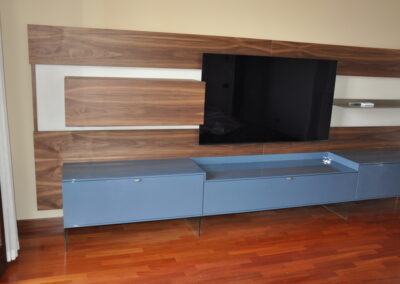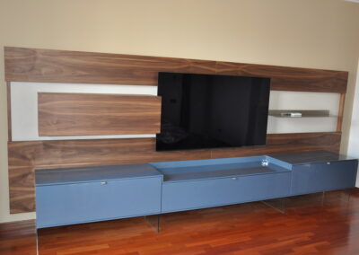 Il pannello boiserie in noce funge da sfondo continuo per la TV e gli elementi sospesi, valorizzando l’ambiente e nascondendo cablaggi e staffaggi. Le basi contenitive in laccato lucido, sollevate da sottili supporti in vetro, alleggeriscono la composizione pur offrendo grande capienza.