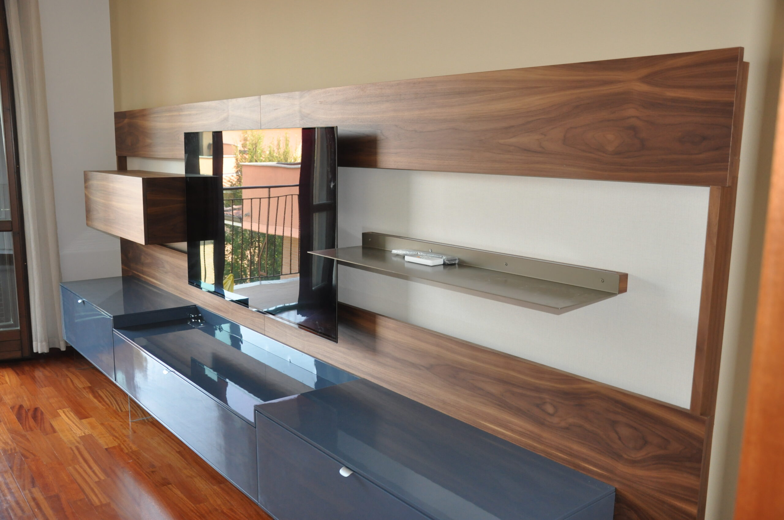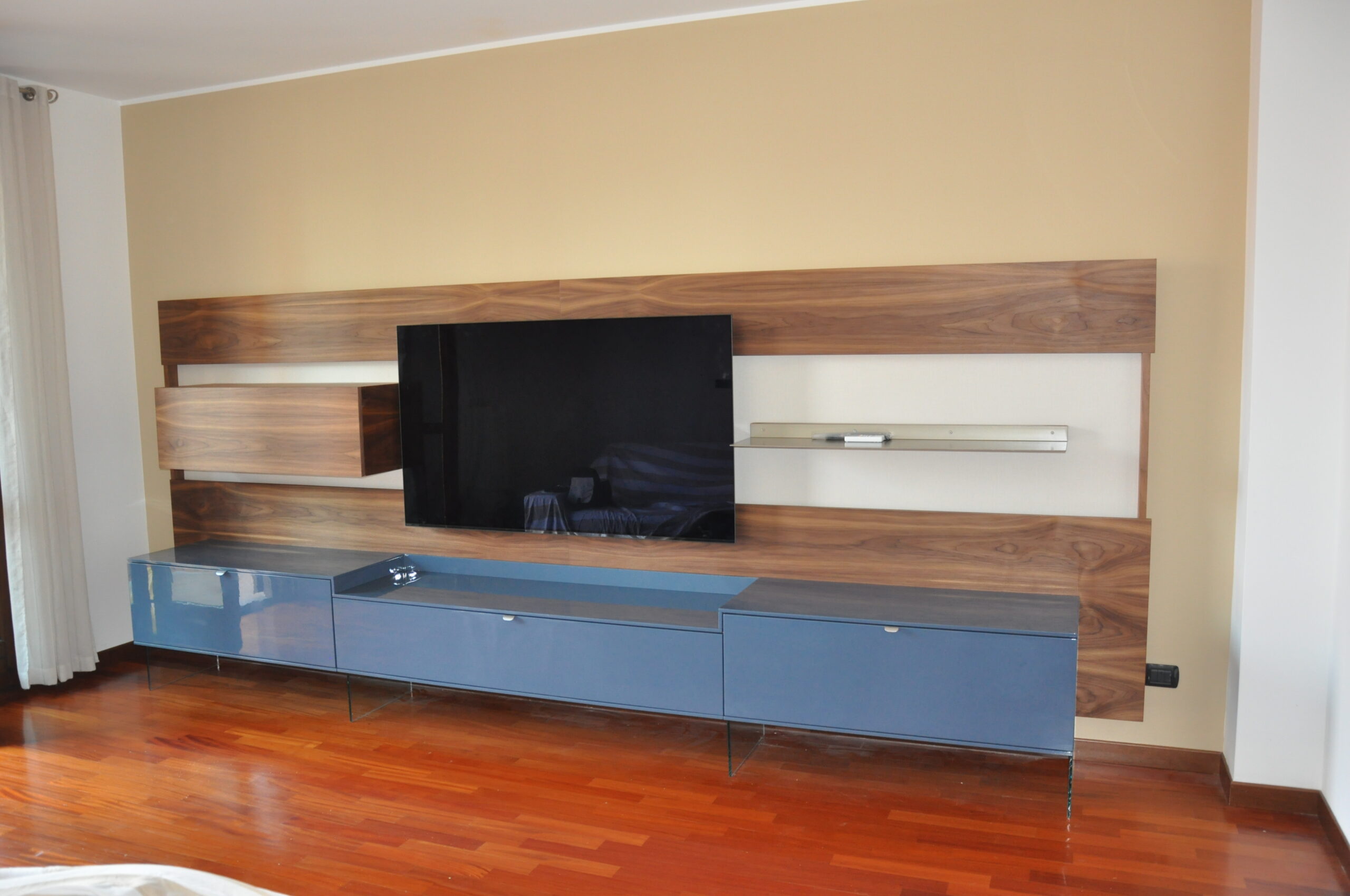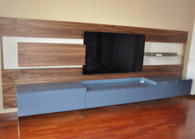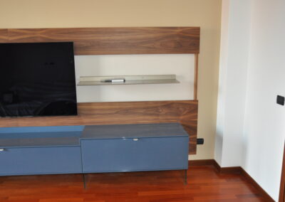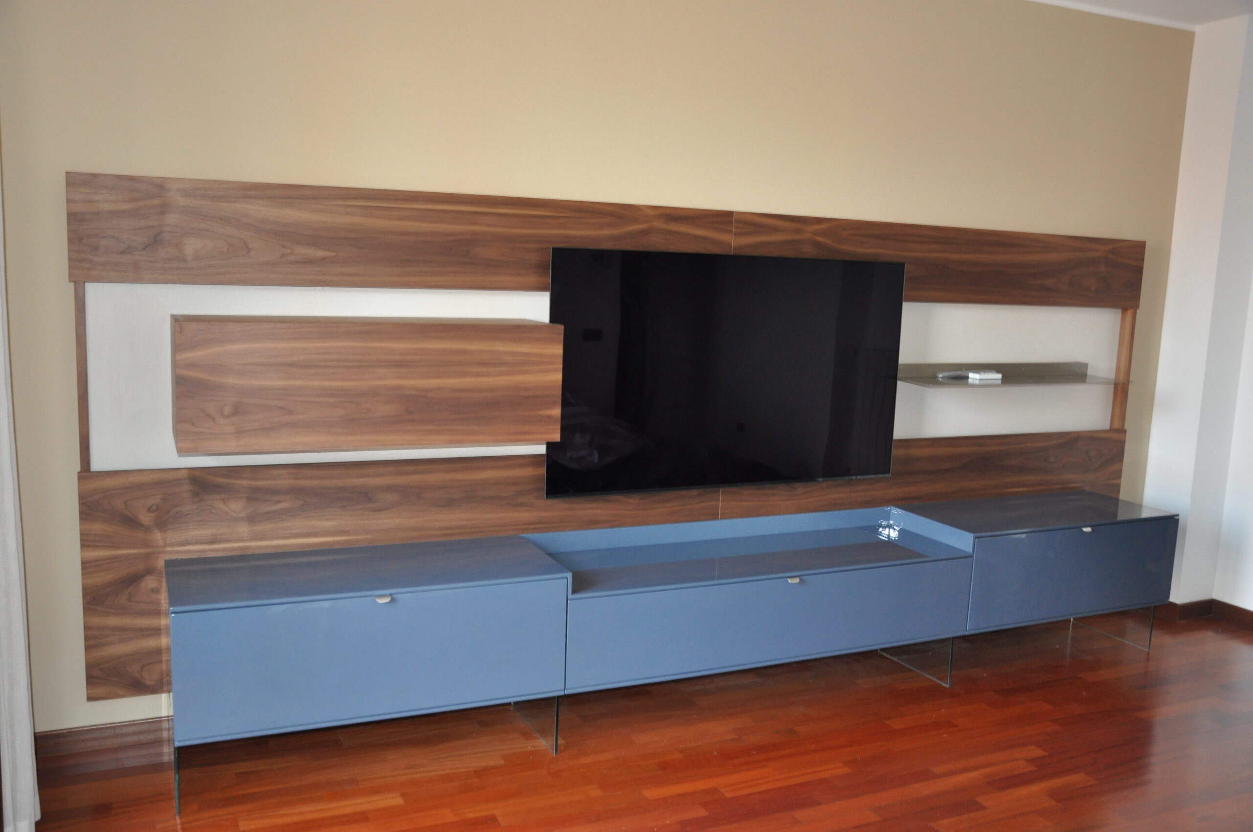 Il pannello boiserie in noce funge da sfondo continuo per la TV e gli elementi sospesi, valorizzando l’ambiente e nascondendo cablaggi e staffaggi. Le basi contenitive in laccato lucido, sollevate da sottili supporti in vetro, alleggeriscono la composizione pur offrendo grande capienza.