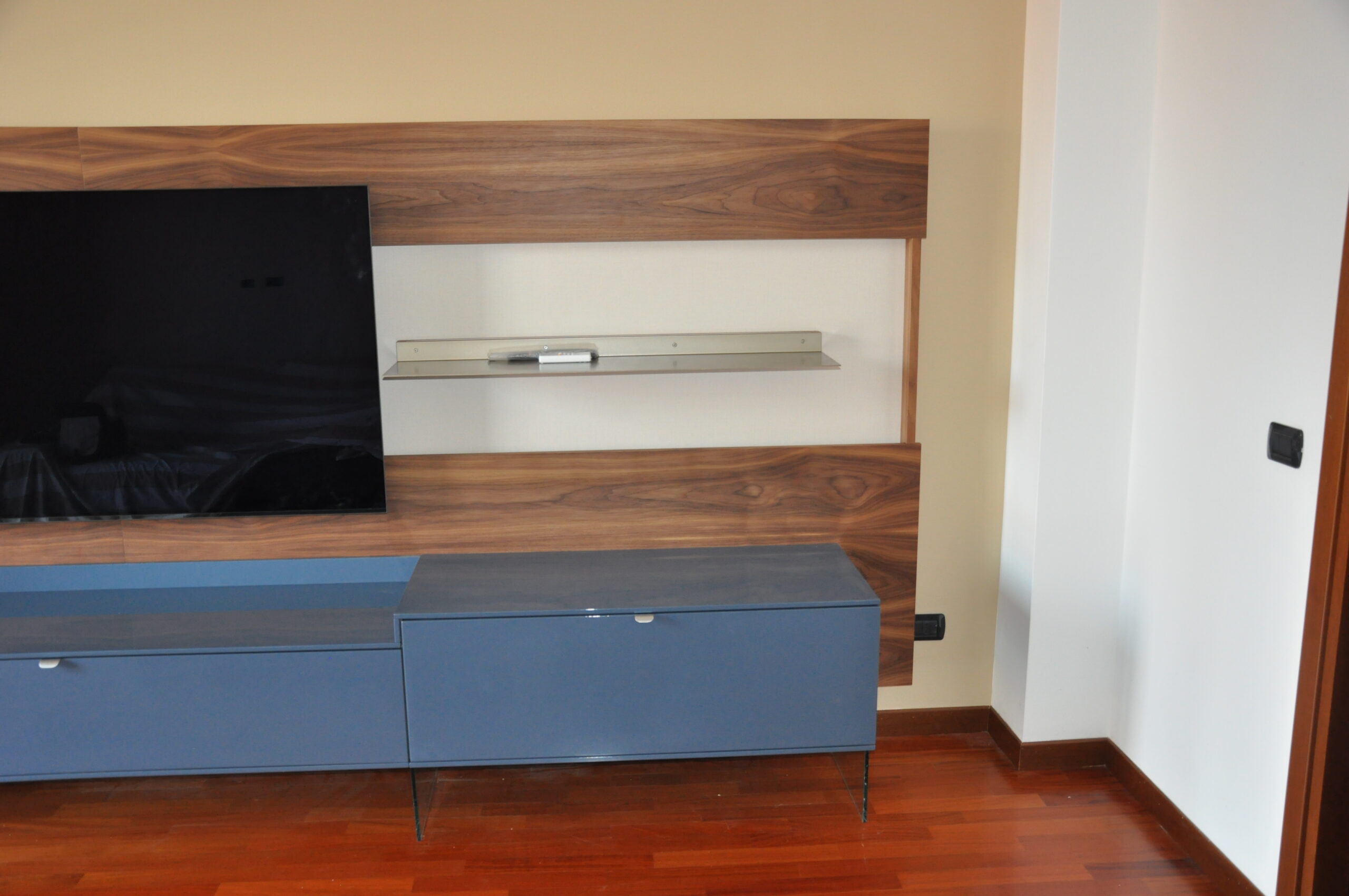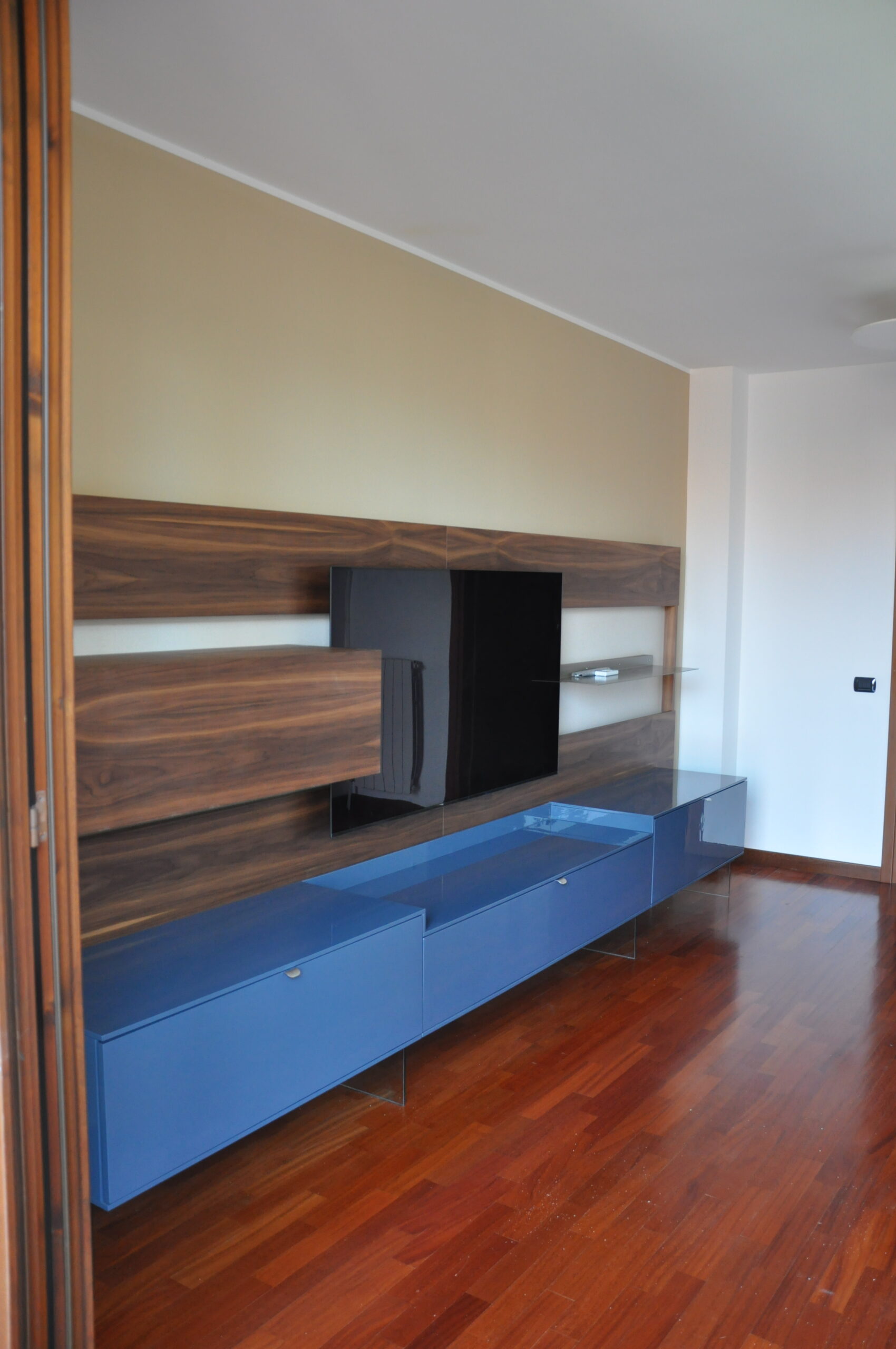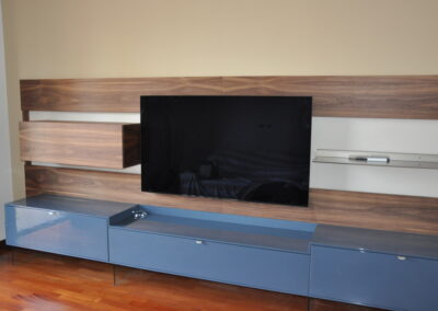 Un progetto su misura che abbina materiali nobili e finiture contemporanee: il calore del noce naturale incontra la raffinatezza del laccato lucido blu notte, dando vita a una parete attrezzata dal design elegante e funzionale.