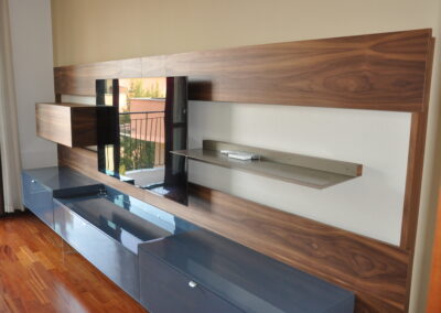 Parete soggiorno moderna in noce e laccato lucido