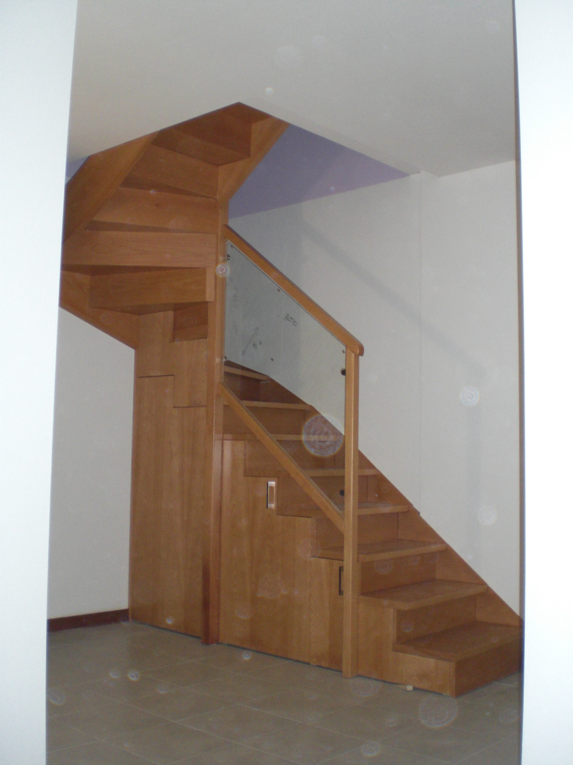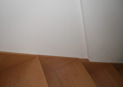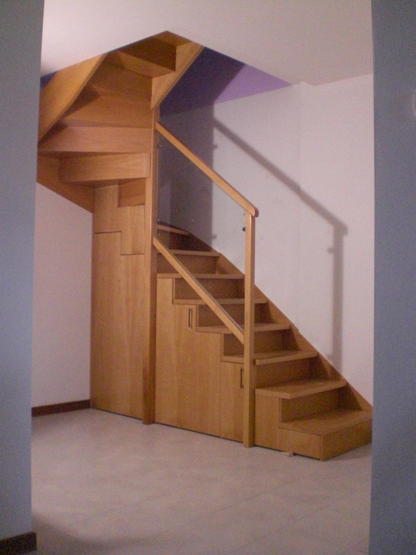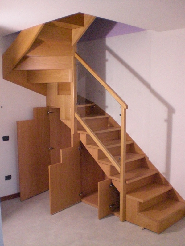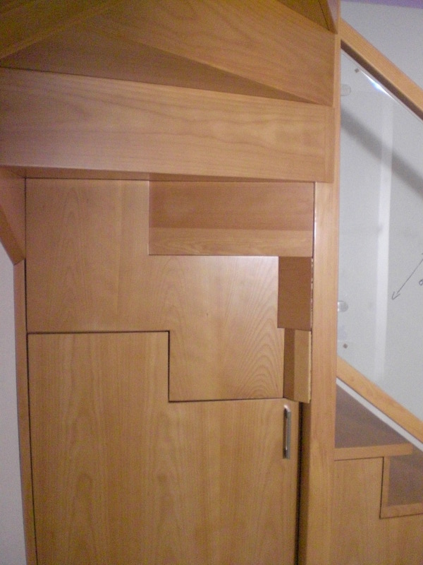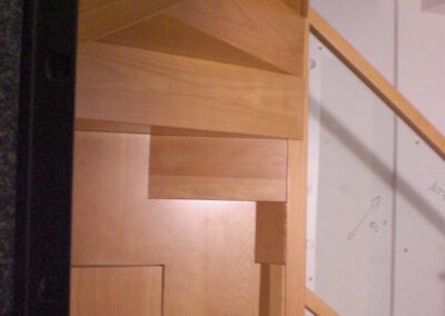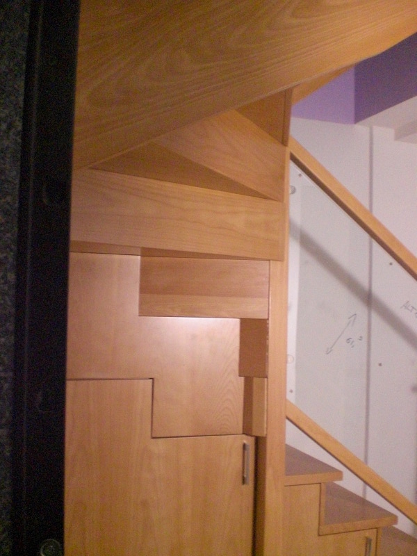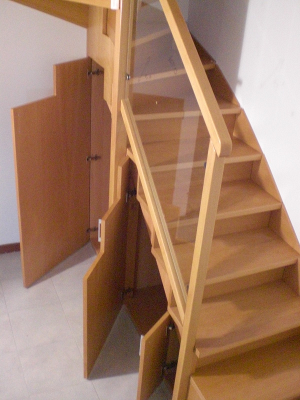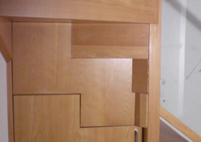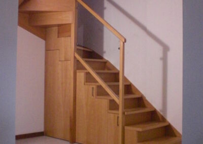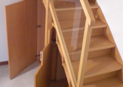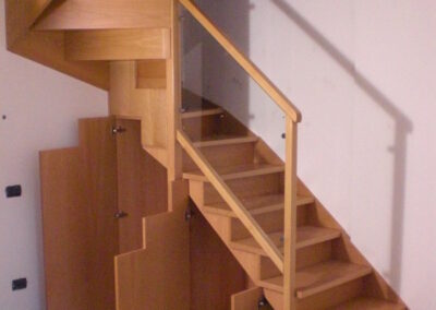 Sotto la rampa è stato progettato un mobile contenitore su misura, composto da ante sagomate che seguono perfettamente la geometria della scala. L’apertura avviene tramite maniglie a gola incassate, con cerniere ammortizzate per un utilizzo silenzioso e confortevole. Gli spazi interni sono completamente personalizzabili: possono ospitare vani chiusi, ripiani, appendiabiti o zone aperte a giorno, secondo le esigenze del cliente. L’intero progetto è stato pensato per unire estetica e praticità, offrendo una soluzione artigianale su misura, ideale per ambienti dove ogni centimetro conta.